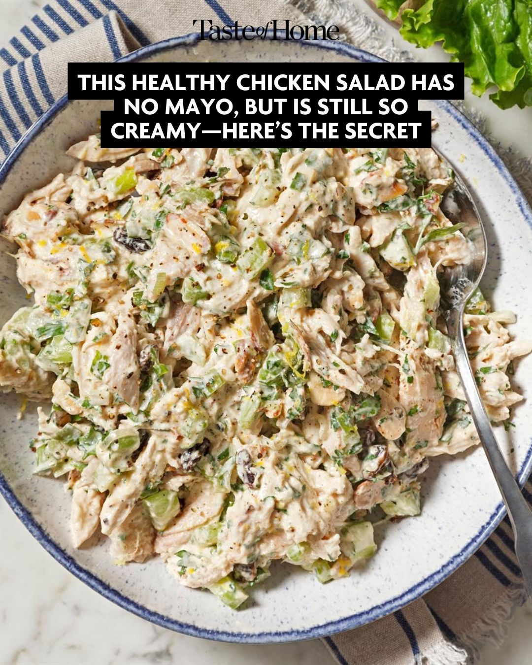 Creamy and packed with fresh flavors, this wholesome chicken salad no-mayo recipe cuts back on calories and fat, but not on flavor.