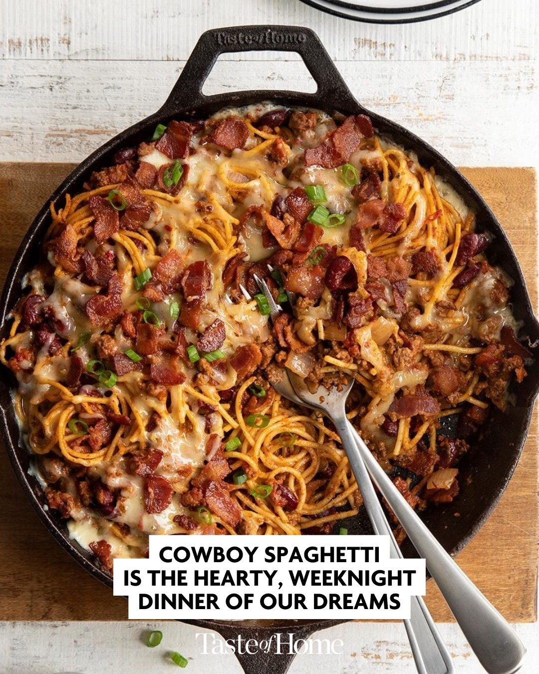 Tex-Mex meets Italian in this cowboy spaghetti, a hearty pasta casserole that bursts with bold flavor thanks to bacon, ground beef and savory beans.