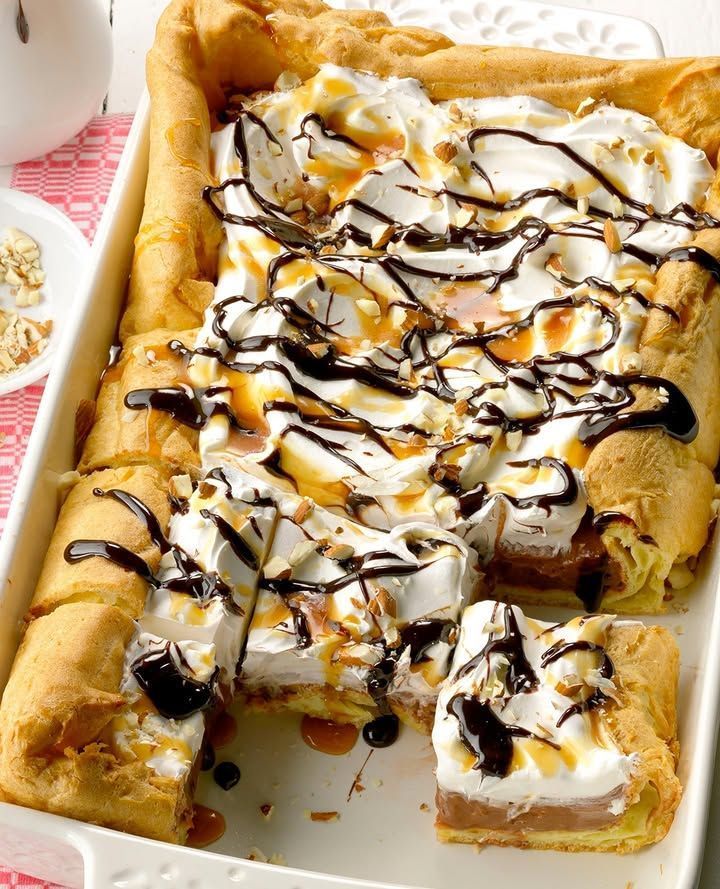 This cream puff dessert is one of the many potluck-friendly desserts made in a 13×9 pan. The big difference-maker here is the crust, which is the same pastry used for cream puffs. It’s a sophisticated detail that will earn you a lot of credit despite the fact that it’s surprisingly easy to make.