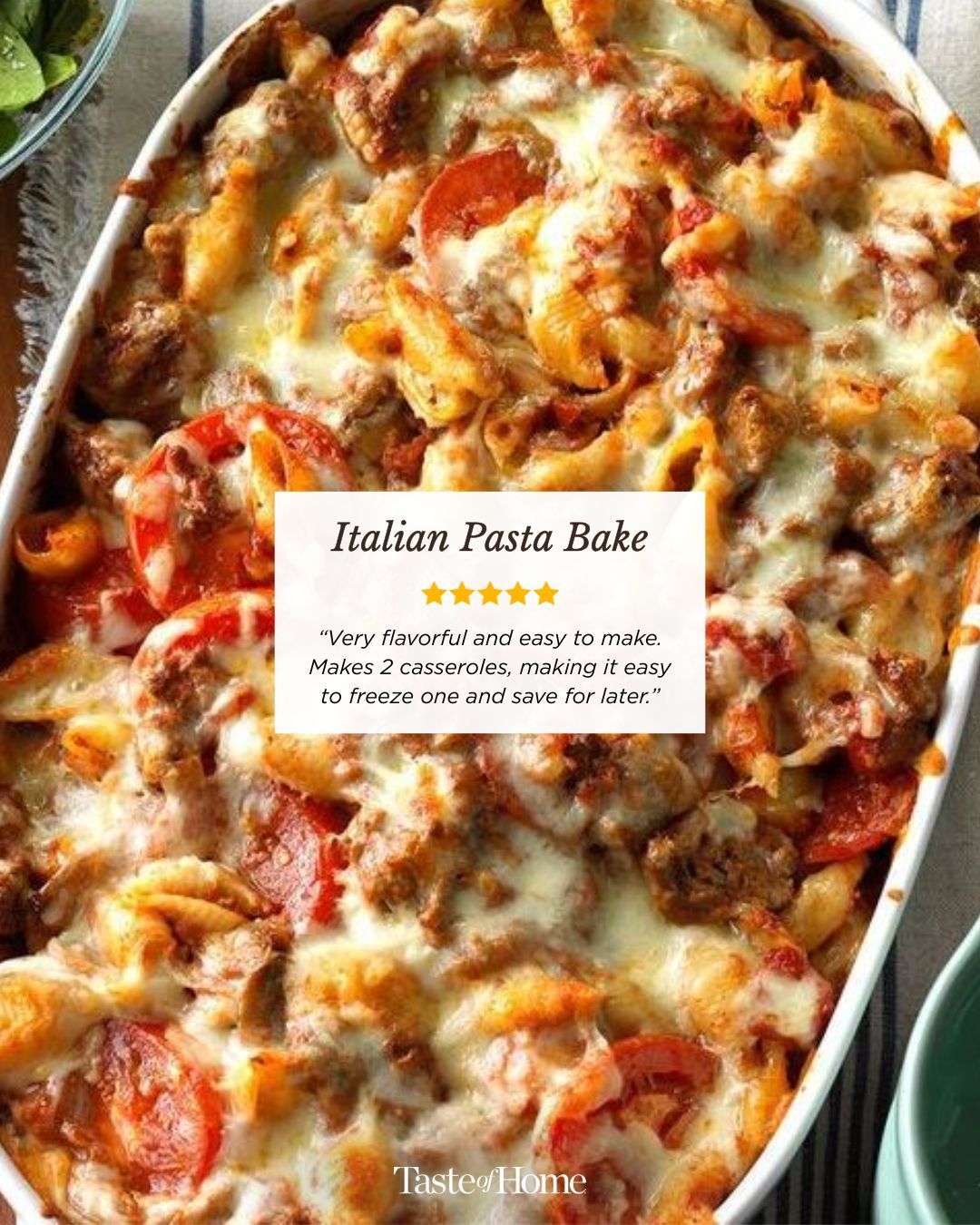 This Italian pasta bake recipe calls for ground beef, pasta shells, canned tomatoes and a few other ingredients, but can be easily swapped out to customize the dish. No matter if you prepare it for a weeknight dinner, potluck or contribution to a meal train, this pasta casserole recipe should be penciled into your meal plan ASAP.