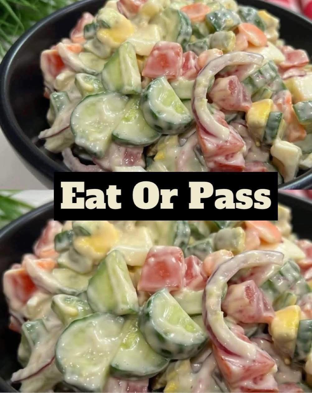 Cucumbers and sweet onions, marinated in a slightly sweetened white wine and rice vinegar dressing with mustard seeds and tossed with fresh tomatoes.