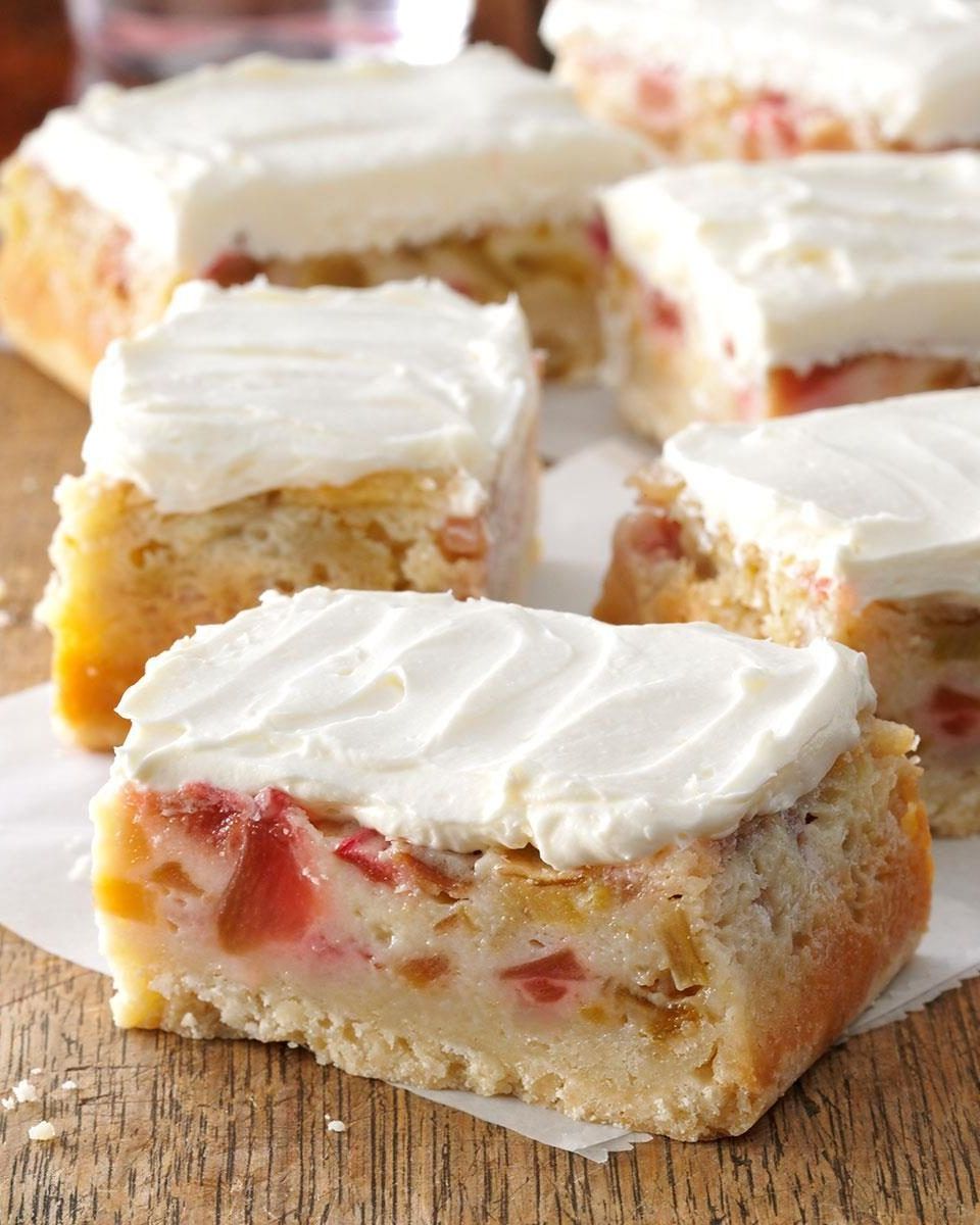 A layered dessert with a buttery crust, a rhubarb-filled custard and a sweet and tangy cream cheese topping, rhubarb bars are a potluck hero and truly one of the best rhubarb recipes. You can bake them in one pan and cut them into whatever size you desire, or make two smaller desserts to share. Using fresh or frozen rhubarb means making these delicious bars anytime.