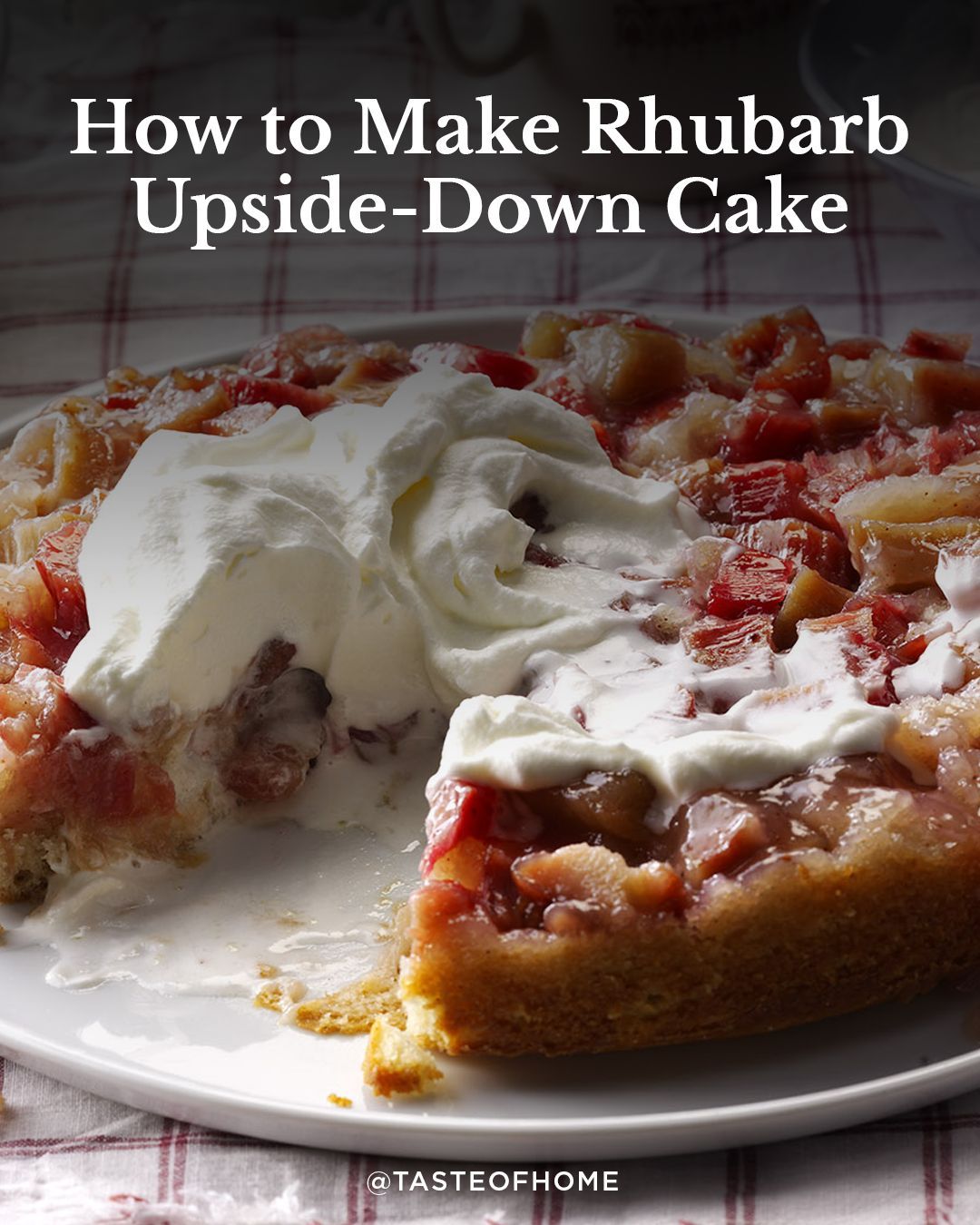 Spread the cake batter over the rhubarb base and bake until a toothpick inserted in the center comes out clean, about 35 minutes. Loosen the edge immediately and invert the cake onto a serving dish. Serve warm with a spoonful of whipped cream.