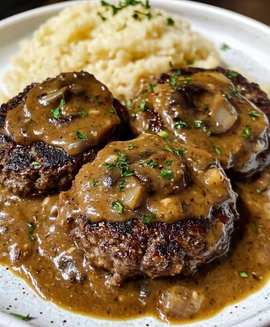 Garnish the Smothered Hamburger Steaks with freshly chopped parsley before serving. This dish pairs well with mashed potatoes or buttered green beans for a complete meal.
