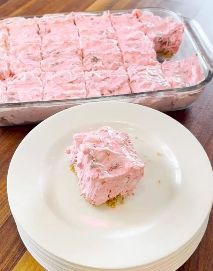 I decided to create my own recipe for strawberry delight. It is sweet but not too sweet, has a lovely fluffy texture and boasts a beautiful pink color. A graham cracker base provides a crunch beneath all that creamy filling. And, of course, it has lots of strawberry-pineapple flavor.